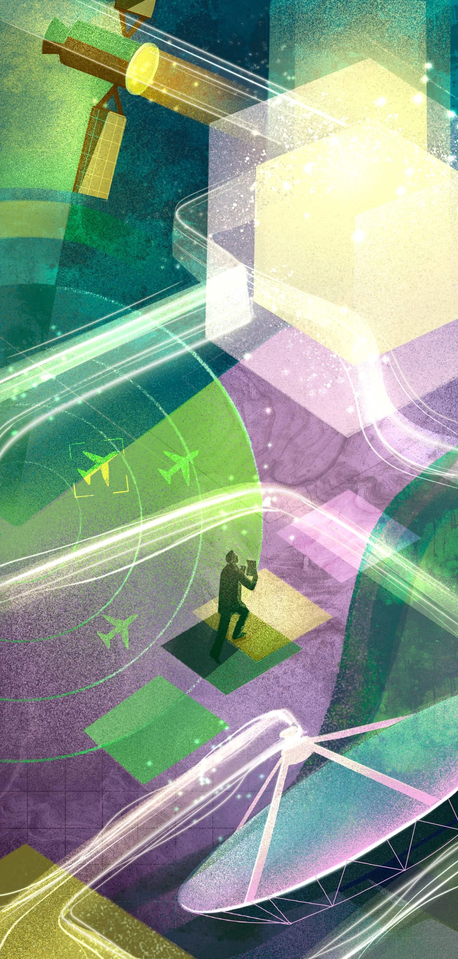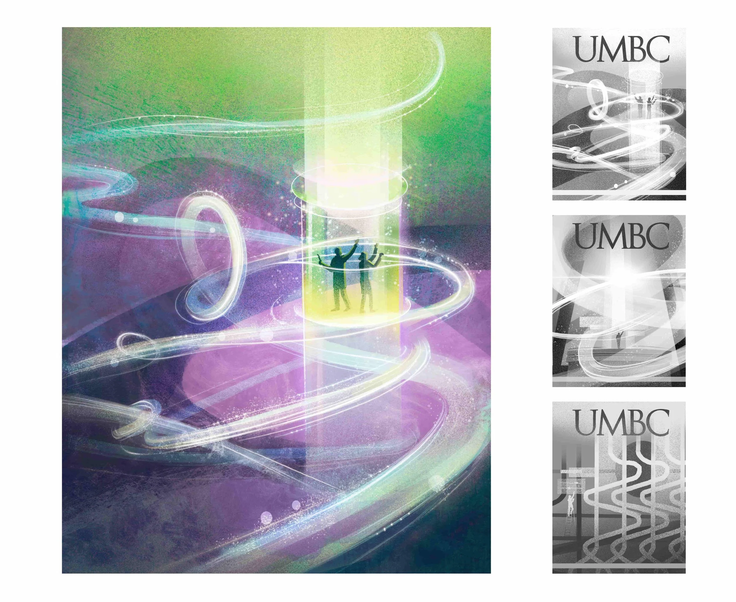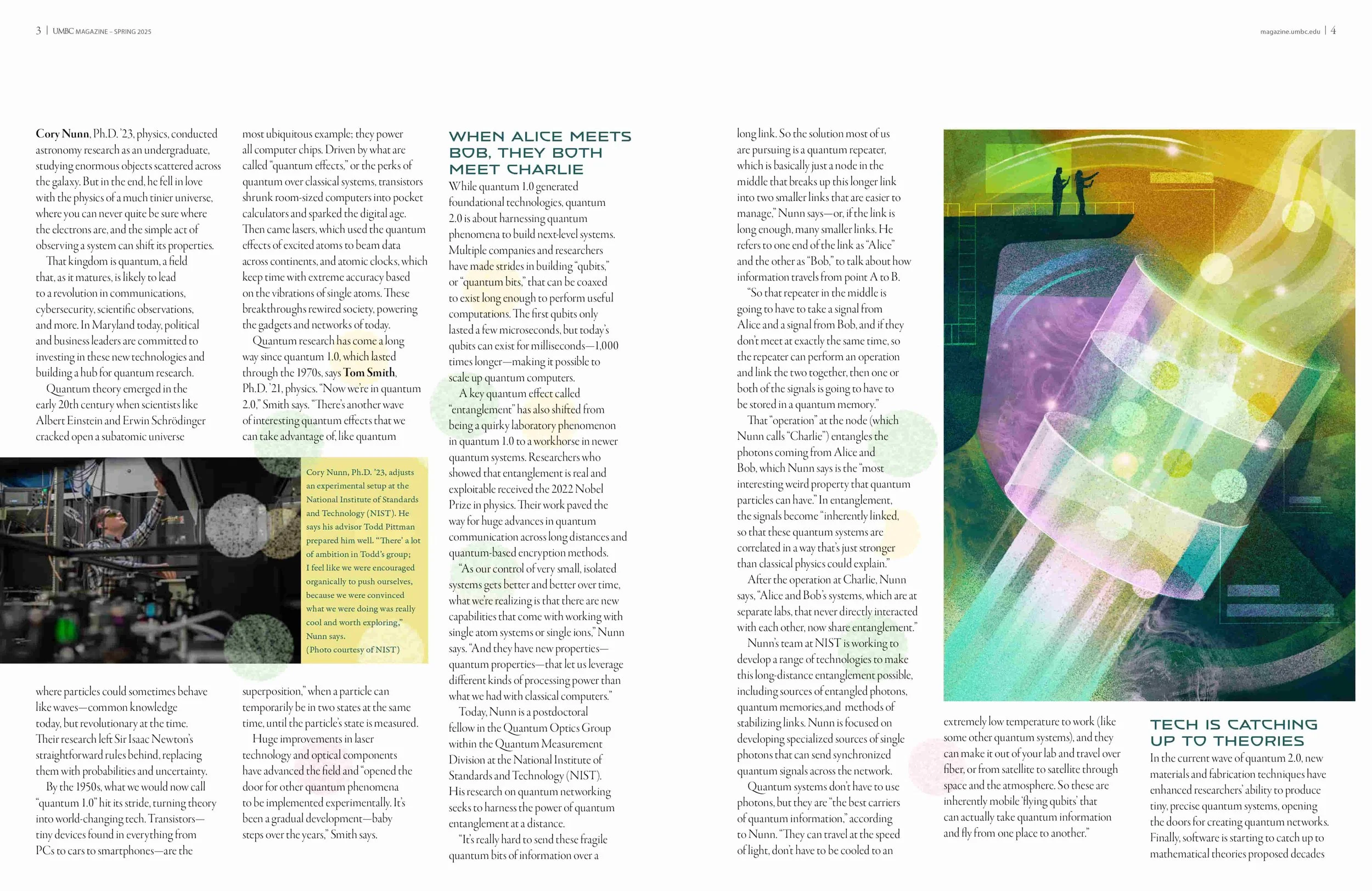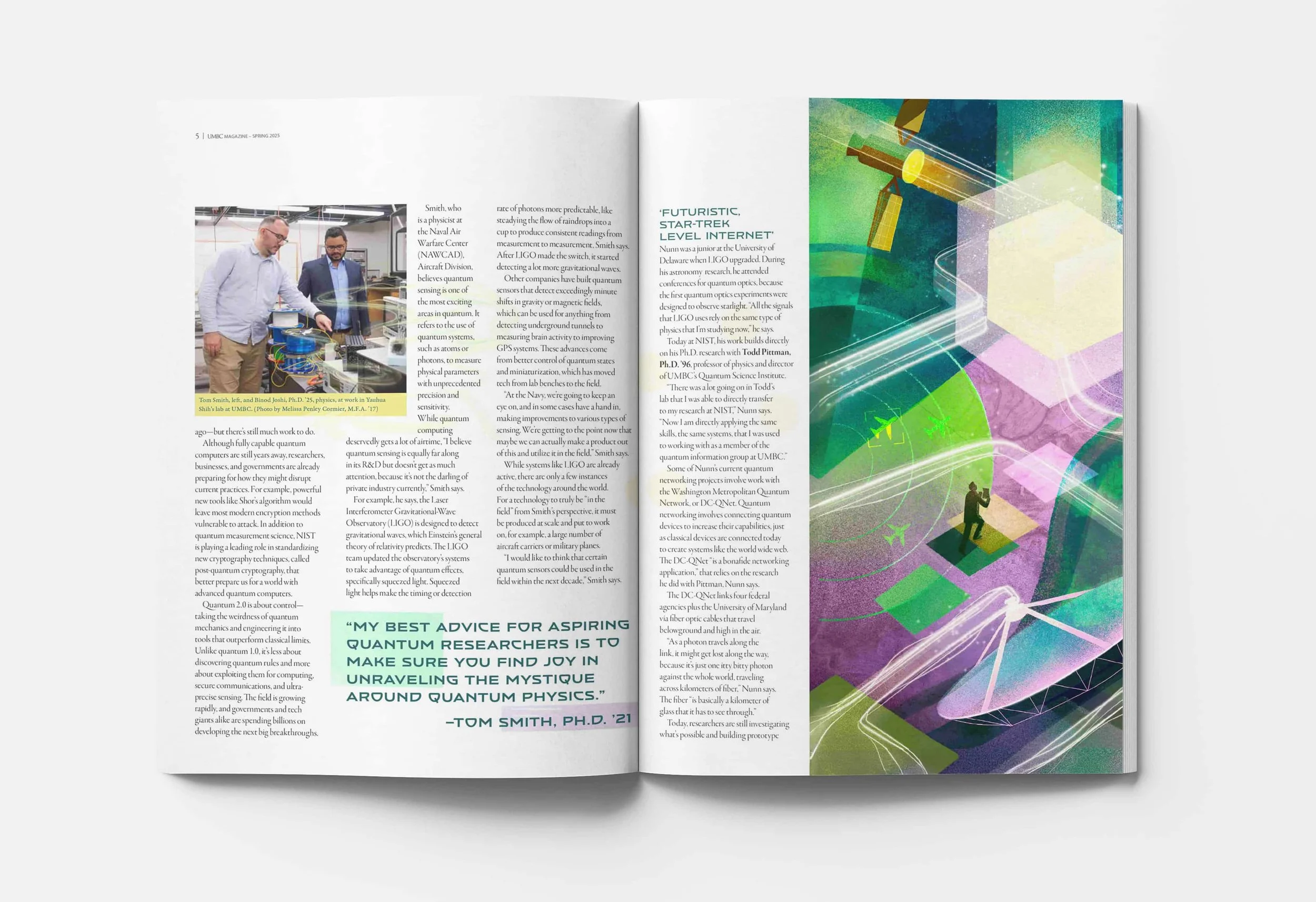 Illustrations for a UMBC Magazine feature on how alumni like Cory Nunn and Tom Smith are shaping the future of the rapidly growing quantum technology industry.